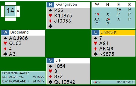 Når motparten bruker overføringsmeldinger etter åpning 1kl, gir det oss muligheten til å vise en farge billig. Det er oftest en fordel, men ikke alltid. Nils Kvangraven doblet Boye Brogeland sin 1hj (som viser spar) for å fortelle om at han ville meldt inn 1hj. Nå var det kun valget mellom pest og kolera igjen. 1hjxx ville stått i omtrent ti stikk og 2ru kosta egentlig 1400 i beit. Nils "slapp" med 1100, men det var grisedyrt mot 480 i 4sp på det andre bordet. Geir Helgemo i syd-åpent rom, var også en stund i 2kl i syd, men slapp unna sine 1100 i beit. _____________________________________________________________________________