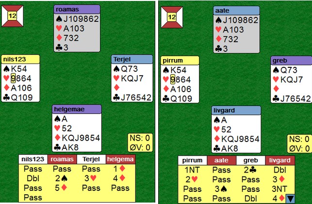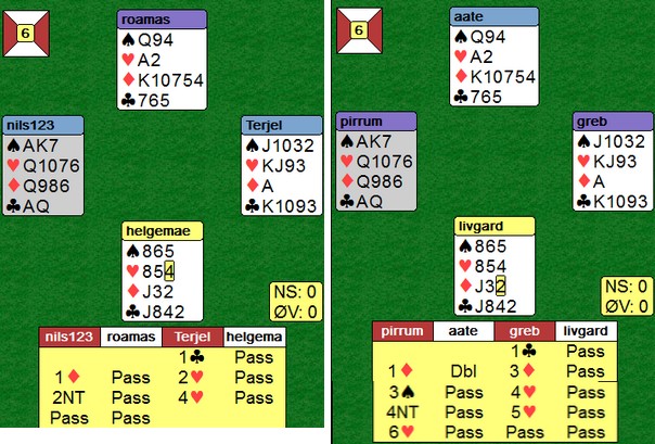 Per Erik Austberg var forhindret, så i hans sted stilte eks.landslagsspiller Odin Svendsen. Det fjerde paret denne gangen var veteranlandslagets Helge og Roald Mæsel. I tillegg spilte Nils Kvangraven - Terje Lie og Allan Livgård - Terje Aa. Det var en svært velspilt kamp over 16 spill synes jeg. Kortene var lagt på forhånd og det var mange slemsspill. Når vi ser alle kortene, er bridge lett. Det ble gjort masse gode avgjørelser av alle par, selv med kun sine 13 eller 26 synlige. Det var jammen ikke lett å vinne IMP!! Den første utgangssvingen kom til Nils og Terje der de dundret på i meldingsforløpet. Nils åpner på en hånd de fleste av oss passer og Terje Lie melder utgang der mange ville maks invitert. Når sparkappen gikk, var det ikke mulig å hindre hjemgang i 3NT. Jan Tore og Odin stoppet i normalkontrakten, men måtte betale ut en tier. Et fint poeng av Terje at han ikke melder NT med to små hjerter. Makker skal ofte være spillefører, så 1sp som overføring til 1NT virka smart. Dette var det mest interessant spillet, synes jeg Poenget er øst sin andre melding. Begge vest viser hjerter med 1ru-meldingen. Terje Lie løfter bare til 2hj, mens Jan Tore Berg hopper til 3ru for å vise singelton og hjerterstøtte. Over 2NT (minst invitt) hopper Terje Lie nok en gang forsiktig til 4hj. "Jeg har tillegg, men ikke nok til et cuebid". Odin Svendsen er naturlig nok ikke til å stoppe på det andre bordet. Jeg regner med at dette spillet vil bli diskutert på webmøtet etter kampen. Å splintre singel ess liker ikke jeg fordi det gir et galt bilde av håndens spillestyrke. Makker forventer honnører andre steder enn der de er i virkeligheten. Terje Lie på det andre bordet var uvanlig forsiktig igjen. Når du ser alle kortene, er det en helt grei slem å være i. Det er muligheter både i spar og kløver for det tolvte stikket, men ingen av fargene satt. Med f.eks ruter ut, står det slem om en velger å ikke røre trumfen. Tre ganger kløver for å kaste en spar og så krysse. Når hjerteråtteren ikke kan gi stikk, vil slemmen kunne vinnes. I praksis tror jeg ikke dette er beste spilleplan. En enkel sparkapp er nok matematisk beste plan, kombinert med knekten tredje i kløver. Venstrehåndsarbeid av Roald og Allan i 6hj var spillet over på et minutt. To ganger hjerter før han stjal to spar på den ene hånda og to ruter på den andre. I posisjonen under til høyre var det bare å slippe den første eller den andre kløveren og 12 stikk var hjemme uansett hvordan fargen satt. Spillet ble (selvsagt) kopiert på det andre bordet. Panterdobling av Jan Tore Berg Panterdobling er et uttrykk for å doble et utgang som står hos motparten når du "vet" at de vil ta ut. 3NT er til å slenge i veggen, men Allan Livgård som hadde meldt 3NT med to små i motpartens farge turde ikke stå med og stoppa i 4ru. Roald Mæsel løfta fint makker 4ru til 5ru på det andre bordet og vant en fin utgangssving. Så var det en storeslem ved begge bord Helge Mæsel sin åpning i 4hj var mildt sagt i overkant. Jeg kjenner de som til og med ville åpnet med 2kl for å hoppe til 4hj neste gang. Han kom imidlertid sterkt tilbake. Legg merke til Roald Mæsel sin 4sp-melding. Når makker åpner med 4hj, skal den fargen være trumf og 4sp setter fokus på det svake punktet i ruter. Nå var ikke Helge til å stoppe. Allan legger også inn en storeslemsinvitt med 6ru og Terje Aa brukte ikke mange sekunder på å melde 7hj, Nye konvensjoner Det dukker stadig opp meldinger jeg ikke har sett brukt på denne måten før. Etter 1hj - 1sp - 2hj kan det være vanskelig hvis 1sp-melderen har gode kort. Mange vil måtte kreve med 3-kortfarger på 3-trinnet. Terje Aa og Allan Livgård har løst dette ved å spille 2sp som et generelt utgangskrav. Makker har alltid seks hjerter når han gjentar den over 1sp, så hvis syd har lang spar og svake kort, må han passe. Det er godt mulig de har andre måter å vise en svak hånd med spar (1hj - 2sp kanskje?) 6sp var uavgjort spill siden det var bare å stjele ruterutspillet, ta ut trumfen og kappe hjerteren. Et IMP er et IMP Selv med åpne kort vil mange slite med å vinne tretten stikk, men Terje Lie hadde ingen problemer uten å sett kontrakten i fare. Hjerter ut til esset (bort med en kløver), ruter ess og ruter til damen fulgt av fire ganger spar. Når trekort ruter hadde fire spar, forsvant to kløver i bordet og en kløverstjeling gir det trettende stikket. Fint håndverk som betaler seg bedre i par enn i lag. Skulle noen stjele spar tidligere, er tolv stikk aldri i fare. ______________________________________________________________________________