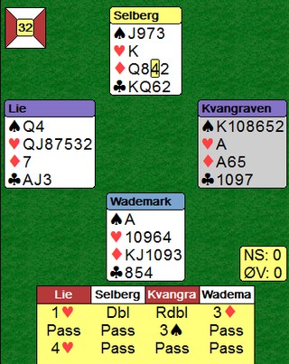 Etter to knepne tap og en liten seier, trengte Norge et godt resultat mot Sverige. Det er ingen lag som har scoret noe særlig, så det er alle muligheter enda. Andre spill - Åpent Rom: "Bid your suits" Jeg ville meldt sparen min i øst i første melderunde. Det er ikke sikkert Terje og Nils hadde klart å stoppe under utgang likevel, men nå ble det i alle fall umulig siden 3sp må være krav. 4hj er slettes ingen håpløs utgang med hjerteren 3-2 og en kløverhonnør i syd og ellers ikke alt for skeivt fordelt. Etter nords opplysende dobling er delkontrakt absolutt å foretrekke. Spill 18 - Lukket Rom "500 out of nowhere" Hadde noen passet mot meg med øst sine kort, hadde jeg beskyldt dem for svindel. En utrolig aktuell pass på makkers negative dobling og 500 mot det som ser ut som maks en delkontrakt. Har svenskene virkelig dagen sin mot oss? Nils og Terje kommer i 4sp og går to beit. 12 IMP til Sverige som leder 12-2 etter to spill. Spill 19: God oppvurdering av Allan Han valgte å oppvurdere denne fine 14-poengeren til 15-17 og kom med det i utgang. Jeg vet ikke om den kan beites med åpne kort, men ruter ut til damen gjorde spillet ikke så vanskelig. Spar i stikk to og da var det 1-2-4-2 = 9 stikk. Jeg vet ikke hva du synes om Nils sin gjenåpning i ugunstig sone. Terje gjorde nok det beste ut av situasjonen ved å passe og etter et ikke helt topp motspill ble det hele ti stikk og + 480 ut for minus 2 IMP. En blå lapp av syd og helvete hadde vært laus. Litt mye parturnering, unge Kvangraven? 17-5 til Sverige Hvis Nils har tenkt å spille en egen kontrakt, er det en logisk brist å doble fordi han vet at makker har minst fire spar og minst tre hjerter, ofte 4-4 i major. Når han selv har 4-4 i minor er det skummelt å melde seg på fordi det er ingen tilpass. Han håpet vel at makker hadde syd sine kort (og vel så det).