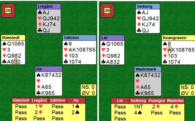 Spill 20: Forsiktig av Terje Aa (og Allan?) Jeg vet ikke hva du ville meldt på syds hånd andre gang, men 2sp ser da ikke dumt ut med renons i makkers hovedfarge, selv om han har 10 honnørpoeng og god fordeling? Denne gangen hadde makker lite bortkastet i hjerter og de andre fargene satt greit. Kanskje Allan kunne strukket seg til 3sp også? Han har tross alt 15 hp og en slags NT-åpning? Sverige banga ut og nok et stor tapsspill for oss. 10 nye IMP til Sverige som leder 24-2.