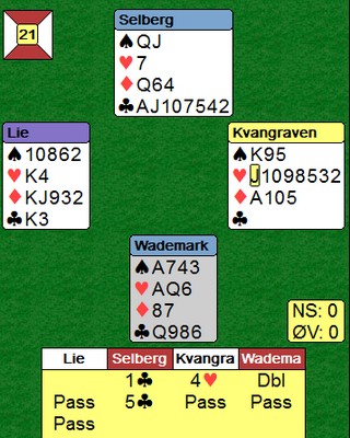 Spill 21: Feil majorfinesse av svensken Nils spilte ut hjerter knekt mot 5kl og jeg skjønner godt at svensken tok kappen for å kaste en spar. Vi som kjenner Kvangraven sine sperremeldinger hadde lett vunnet 5kl!! Terje og Allan dobla 4hj etter et helt annerledes meldingsforløp og tok ei beit. 5 IMP til Norge.