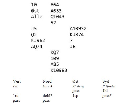 Stig servet kløver dame. Even stikker med A og forlanger hjerter dame som går rundt til kongen. Stig tar for kløver kn. Helt uanstrengt ligger så ruter 6 i disken. Stakkars Even som ikke vet mer om Jørgen sine honnører i syd enn at han har kløver konge klarer ikke å gå opp på Damen. Det ender da med 8 stikk som gjør at kampen ender med 19 – 14 seier til Stjørkjerik.
