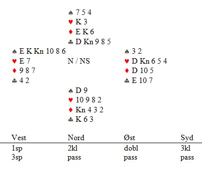 Vridd til syd ble jeg spillefører i 2 spar fra syd etter at makker åpna 1 kløver og jeg hoppet svakt til 2 spar. Motparten server tre ganger kløver ut til stjeling, og så er det din tur. Hva nå?