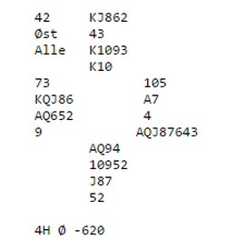 "Hva tror du jeg spilte ut fra nord? Joda, kløver 10. Da var i praksis spillefører sjanseløs." ______________________________________________________________________ Legg merke til at det står 4H Ø -620 under selve spillet. Det er en doubledummy analyse som ligger i regnskapsprogrammet. Programmet kan ingenting om bridge, annet enn det kjenner reglene for å følge farge, hvem som spiller først i neste stikk, kortenes rang og hvordan trumfen kan brukes. Programmet spiller kortene i alle mulige lovlige rekkefølger (mange millioner varianter) og teller stikk. Den høyest, teoretisk mulig scoren for en av sidene vises. Jeg har enda ikke opplevd å ta programmet i feil og når det står at det kan vinnes ti stikk i hjerter, er det garantert korrekt. Årsaken til at det står 4hj, er at etter to sparstikk kan ikke motparten skifte trumf for å hindre ruterstjelinger. Da tar spillefører enkelt ut trumfen og henter resten via kløverkapp. Med skift til kløver etter to ganger spar, kan det stjeles to ruter i bordet, med overgang til hånda via kløverstjeling. Syd har 109xx og kan ikke hindre at hjerteråtte kommer med i spillet. Da blir det 0 + 7 + 1 + 2 = 10 _____________________________________________________________________