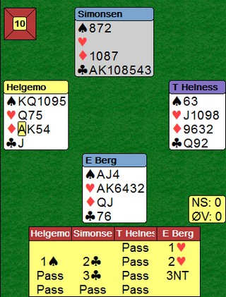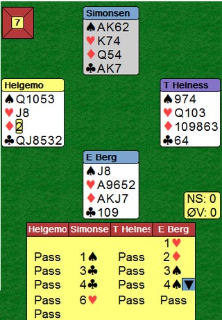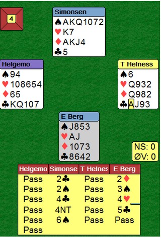 Enda en slem Det var da voldsomt til kort. Steffen fikk ikke satt hjerteren som trumf i tide og måtte derfor ut å gjette. EDxxx og EKKnx i rødt ville vært nok til storeslem, men hvordan kunne han få skjekket hjerterdamen? Etter 3sp gikk det evigheter før neste melding kom og jeg skjønner godt at Steffen sleit. Han tok til fornuften og hoppa ut i 4hj etter å ha prøvd 4kl. Phew, endelig noe rett. Kun uavgjort når Fantoni - Nunes melder 6NT. Jeg tror heller ikke de fikk full kontroll på meldingsforløpet. Trumfen satt 5-1 men det var ikke hvilken som helst singelton.5ru var en veldig fin kontrakt, men Erik hadde nok ønsket seg makkers ruter 9 i bytte mot en av de fire minste.