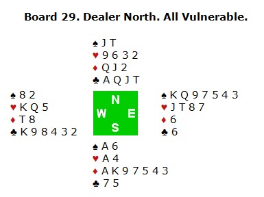 Det var Per Erik Austberg som ønsket å innstille makker Jan Tore Berg til premie for årets dummeste påfunn. Det er å bemerke at da PIL tok kontakt med meg, hadde Jan Tore allerede selv fortalt om spilllet, så selvinnsikt har han i alle fall. For å skjønne poenget med spillet, må du se for seg hvordan skjermen er plassert. De står plassert på skrå slik du ser over. Syd og vest sitter på samme side og ser hverandre. De andre to spillerne ser ikke hva som skjer på deres side. Før Jan Tore rekker å bestemme seg for hvor mange ruter han skal melde, har vest lagt 4sp på bordet. Ikke akkurat noen undermelding, men det kan ikke Jan Tore vite. Han bestemmer seg for å late som han har gode kort, for på den måten kanskje å få spille 5ru udobla. Derfor melder han 4sp (!). Nå våkner vest og spør hva 4sp betyr. Jan Tore må svare som sant er at det viser kortfarge i spar og ruterstøtte. Vest hopper til 6sp! Den fikk han spille og kappa greit spardamen gjennom sperremelderen for +980. Jeg håper for guds skyld at dette spillet ikke var avgjørende for at ABAX ikke gikk videre fra grunnspillet. _________________________________________________________________________