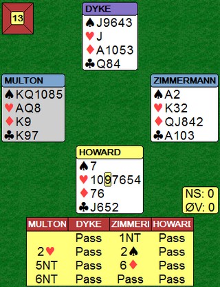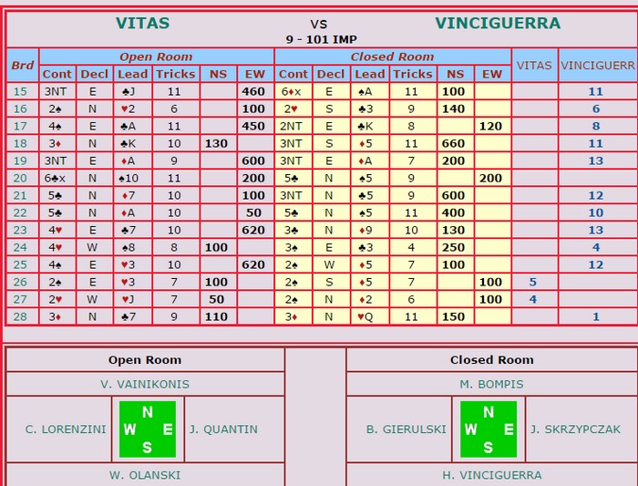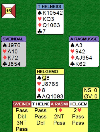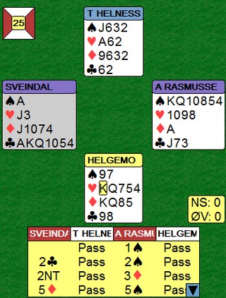Flere som sliter med konvensjonene? Godt å se det er flere enn meg som slilter med å huske. Når Fantoni - Nunes kan gjøre slike feil, er det håp for oss andre. 2sp med tre sonebeit når 4hj er til å slenge i veggen er ikke bra. Tor og Geir kommer i en steinhard 3NT, men hadde vest hatt hjerteresset måtte Noralia klart å cashe fire ruterstikk. Nå ble det fire sonebeiter til tross for at EKD i ruter felte knekten. Jon Sveindal fant hjerterskiftet i stikk fire!! Noralia leder 59 - 45 med fem spill igjen !! Jeg må (dessverre) skrive om de dårlige spillene også. Igjen må jeg stille spørsmål ved bergensernes vurderinger i meldingsforløpet 2NT er krav og kan inneholde mange hender. 3ru skjønner jeg ikke fra Arild Rasmussen, men det er mulig det betyr noe. Ellers ser det rimelig opplagt ut å støtte kløveren til 3kl. 5ru fra Jon var vel også overilet? Det kan enda være mange mulige endestasjoner utenom 5ru. Til 5ru kan dere alltids komme seinere, men "feilen" må være 3ru. Helt sikkert en konvensjonell melding som en av dem har glemt. Dette er en screeshot fra det øyeblikket Jon Sveindal legger ned blindemann i 5sp. _____________________________________________________________________________ Tre spill igjen: 65 - 57 til Noralia Det skjedde ikke noe dramatisk i de tre siste og dermed er en liten sensasjon fakta. Takk og farvel til Monaco og lykke til videre for Noralia.