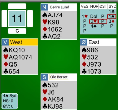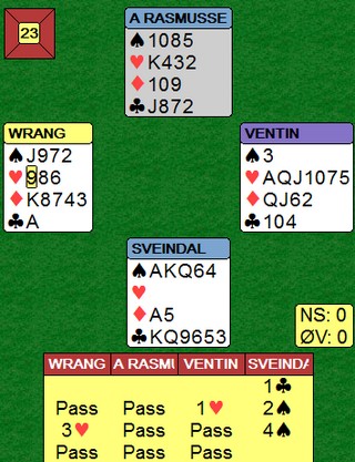 Jeg har tidligere fortalt deg om Howard - Dyke sin offensive meldestil. Her ble de straffet når øst hadde til en opplysende dobling over 4kl. Han så for seg supertilpass og en utgang i hus på 18 hp. Vest hadde en opplagt pass, men fortalte samtidig at kløveren satt som den gjorde. -710 er katastrofe i lag. Arild Rasmussen meldte også inn 4kl, men det gikk det pass rundt og en beit. SÅ ET GLIMRENDE SPILL AV JON SVEINDAL!! Du får hjerter 9 ut som står. Jeg vil påstå at de aller, aller fleste av oss hadde stjålet og lagt ned EK i spar. Ikke Jon. Han kastet rutertaperen sin og du ser snart hvorfor det var så bra?