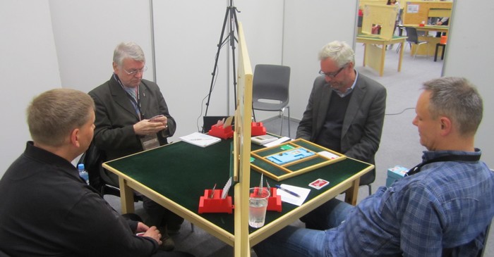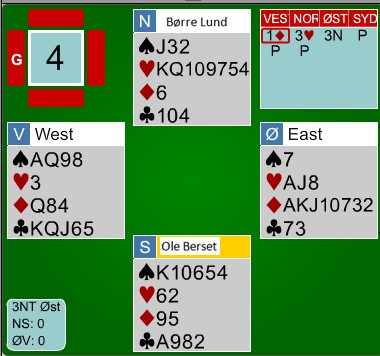 Børre og Ole oppdaga at hjerteren var for tynn til å spille 3NT. Det satt fint i 4sp, men den hadde i alle fall vinnersjanse. KDx i kapp var akkurat det som trengtes og +10 til SLUFSA mot 3NT en beit. Jeg har tro på norsk lag i semifinalen!!