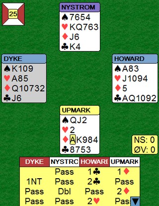 Mer hjerter og så EK i spar. Han oppdager den truende trumfmatten, men ruteravkastet hadde vært magisk. Kløverkongen ble stukket av esset fulgt av enda mer hjerter. Nå må han stjele med spar seks og ta for spardame. Vest har den trettende sparen, men han er blitt tom for hjerter. Han kan stjele kløveren, men må så sette syd inn på ruteresset. 10 stikk og stor heder herfra. SPILL 25 Nå er det spillere som begynner å bli slitne. Hvorfor i huleste dobler ikke Dyke i vest 2ru? Howards 2hj var like underlig når han vet at makker har maks tre og nord har minst fire. ØV kommer i 2NT på det andre bordet og der er det nærmere ni stikk enn åtte. 2hj går to sonebeiter. ___________________________________________________________________________-