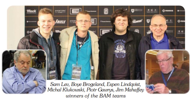 Ikke mindre enn 78 lag stilte til start i det som noen kunne brukt som hviledag før EM par. Vi bridgespillere tenker ikke særlig på kroppslige behov, så hvile, mat og nok drikke er det ikke mange som tenker på. (selv om det med drikke sikkert kan diskuteres. Det er mye B-vitaminer i øl har jeg hørt) Espen Lindqvist og Boye Brogleland lyktes ikke med sponsorlaget Mahaffey i åpent lag, men slo tilbake i dag. I morgen (tirsdag) er det finale for damer og senior lag, mens semifinalene spilles over 4 x 14 spill i åpen klasse. En haug med par starter parkvalifiseringer i alle tre klasser. Jeg ahr ikke helt oversikt over hvor mange som går videre til Semifinalene. Det er ikke mindre enn 250 spill som står på programmet før vinneren av ÅPENT EM PAR skal kåres. Det er CarryOver mellom sesjonen, så denne gangen kan dere ikke klage over "feil" vinner. Her kan alle ta ansvar for egen skjebne. 222 påmeldte par RESULTATER BAM (virker ikke alltid)