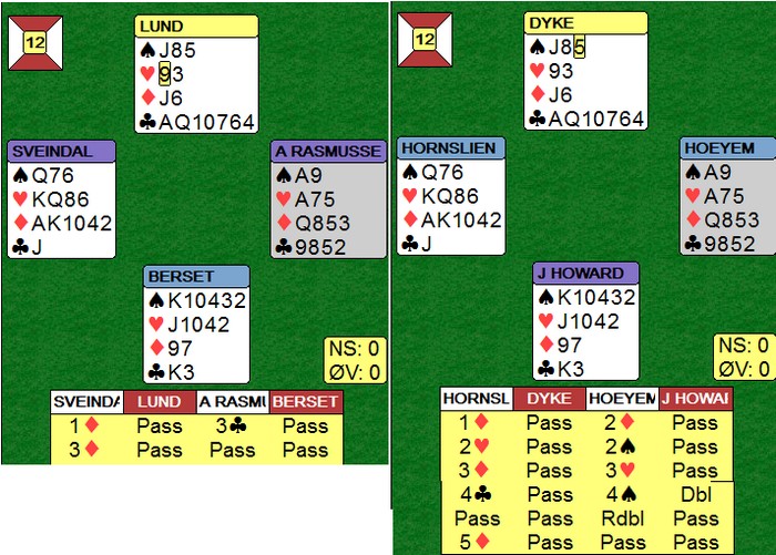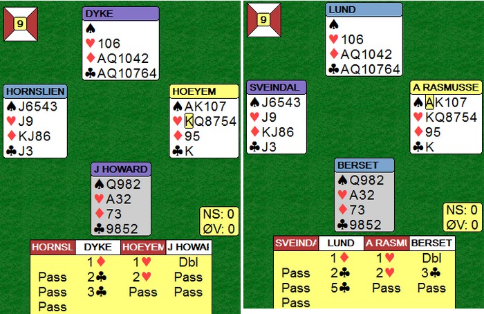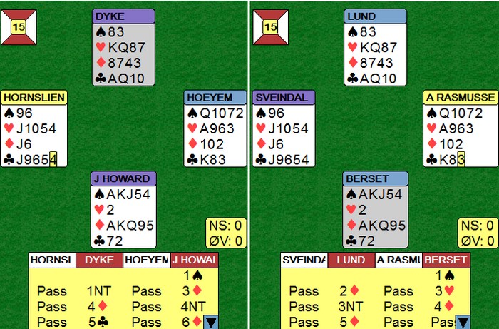 Her har jeg forståelse for Høyem som spør etter hjerterhold hos makker. 3NT står fordi EK i hjerter sitter foran og kløveren 1-1. En heldig utgangssving til Noralia som leder kampen på dette tidspunktet.