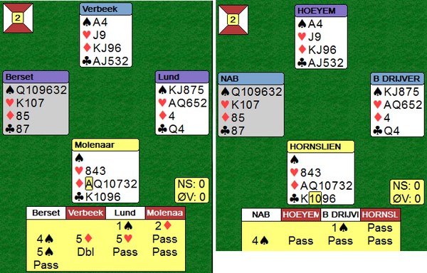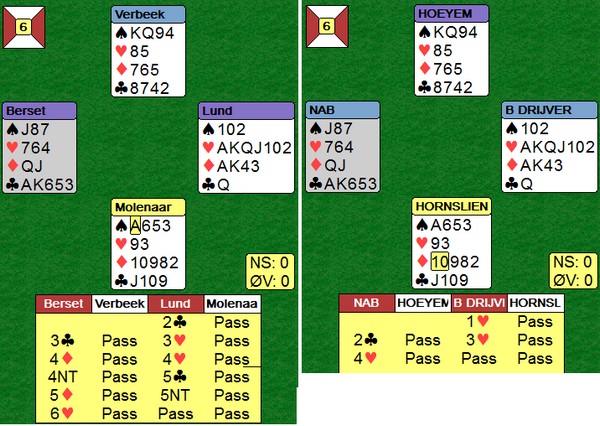 4sp går en beit på det andre bordet og jeg ser ikke helt hvordan Børre og Ole skulle klart å melde på 5-trinnet etter denne innledningen. Kanskje 4NT av Ole over 4sp, men han var sikkert redd for at makker også hadde spar. Jeg har en mistanke om at Ole i vest mente at passen hans var krav og at makker enten måtte melde eller doble i siste hånd. Stillingen etter 10 spill er 38 - 10 til Nederland