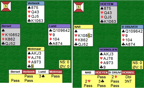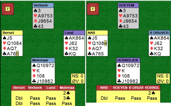 "Du har ikke blitt mørkredd, Aksel Hornslien?". Det er superviktig å ikke bli defensiv i tankegangen, men tørre å gjøre det samme som en ville gjort i klubben på Heimdal. Der hadde Aksel meldt inn 2ru hver kveld, selv i blodsonen. 5ru er nedlegg og Ole-Børre gjør en god vurdering når de stamper i 5sp. Heldigvis står ikke 4sp, så tapet er bare 250 og 6 IMP. ___________________________________________________________________________________