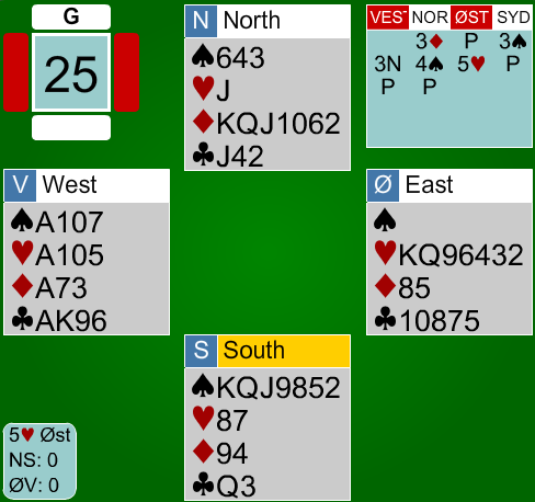 Spillet under pekte seg ut som ekstra interessant. Ved alle fire bord var ØV i utgang, men resultatene varierte fra 4hj -1, 4hj +1, 4hj +2 og 3NT +3. Det mest interessante er hvordan du løser hjerteren best for minst 3 stikk? For enkelthets skyld sier vi at du går for toppen i 3NT på østs hånd, og får liten spar ut fra syd. Ruteren sitter 3-2.