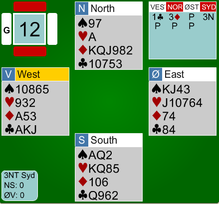 Det står da 3NT? ED i spar - EKD i hjerter - KDKn98 i ruter = 10 stikk? Neida. Pernille i vest spilte ut spar til konge og ess, satt over ruteren et par ganger og fortsatte i spar. Nå brant KD i hjerter inne på hånda og en beit. Fin bridge, spør du meg.