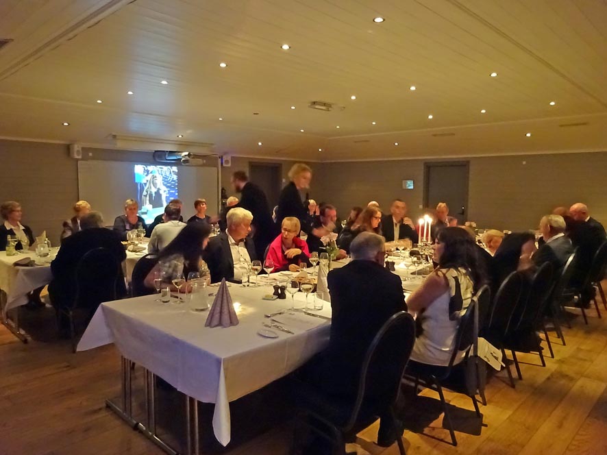 Det blei ei på alle måtar vellukka jubileumsfeiring då klubben feira 75-års jubileet på Bjørnefjorden Gjestetun laurdag 24. oktober. Vi starta med singleturnering på dagtid (sjå sak under) og avslutta med festmiddag på kvelden. Her er eit bilete frå salen laurdag kveld. Fleire bilete kjem etter kvart som vi får samla inn frå dei som fotograferte. Legg gjerne bileta over på ein minnepinn eller CD og lever til Anne Merete.