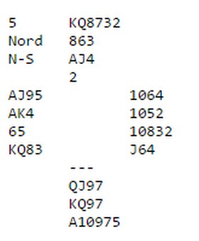 Det er sikkert noe å si til meldingsforløpet, men jeg satt øst og skulle spille 4sp. Syd ville ikke åpne hjerteren, så han starta litt uheldig med ruter ess. Makker la syveren og i neste stikk røffa jeg hjerteresset. Kløver til esset og spar knekten derfra. Alle drar på smilebåndet når nord dekka, men husk at han vet ikke at makker ikke har EK i ruter. Jeg kan fint ha EDxxx i spar og siden bordet er uten inntak, ser det ut som spar ti vil gi stikk: Du skjønner hva som skjedde i spar og det ble kongelig begravelse. Inne på spar ess prøvde syd å gi makker en ruterstjelling. Jeg stakk med damen og nå var nord så svett at han stjal med spar 5 selv om han hadde en ruter (!). Han oppdaga fadesen sånn at det ikke ble revoke, men spar fem ble nå straffekort. Da kunne jeg spille spar ni. Nord kunne ikke dekke og holde meg borte fra bordet på grunn av straffekortet. Jeg rakk akkurat å spille kløver mot damen, godspille den trettende og vips sto det ti stikk og +590. ________________________________________________________________