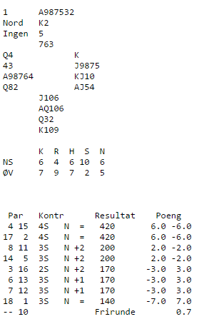 Når du blir spillefører, er det alltid lurt å legge en grunnleggende plan for hvordan du vil spille i stikk 1. Dette trenger ikke være en avansert plan, men så enkelt som om man bør begynne å trekke ut trumfen eller ikke, eller hvilke farger man bør godspille først. Årsaken til at det er lurt til å legge planen med engang, er fordi det noen ganger kan være for sent, dersom man begynner å tenke senere, fordi da kan man allerede ha gjort feil. Her er et eksempel fra første kvelden av klubbmesterskapet som illustrerer dette (trykk på les mer):