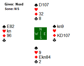 Kløver dame holdt stikk og Pernille fortsatte med to runder trumf. Dessverre viste det seg at trumfen satt 4-2 og at vest måtte få et trumfstikk. På kløver ess fulgte øst beleilig med kongen. Spillefører tok også for kløver knekt før den siste kløveren ble spilt. Nå måtte vest beslutte hva hun skulle gjøre i følgende posisjon: