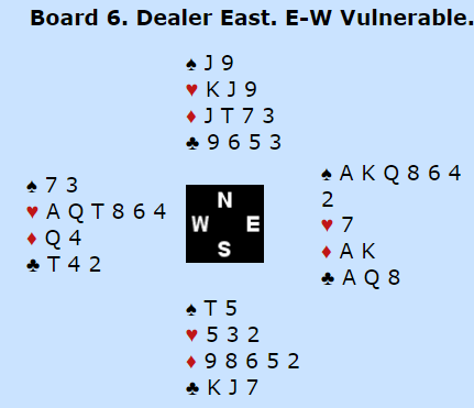 Øst hadde en monsterhånd, og da vest hadde til positivt svar på sterk, kunstig 2 kløver var det mange som ikke greide å bremse. Et sterkt, kunstig kløversystem (sterk 1 kløver) ville hjulpet godt her da øst ville fått vite om mye mer (siden N/S ikke har noe å forstyrre med), mens etter standard metoder måtte øst gjette litt mer. Noen havnet i 7 spar! Det var sjanseløst, den kontrakten avhenger av enten K-J dobbel i saks i hjerter, eller at både hjerter- og kløverkutten går. Så hyggelig satt det ikke, så storeslem var helt dødt. Mer interessant var det i 6 spar. Godt over en tredel av parene vant lilleslem, flere av dem etter et relavtiv aggressivt og svært uheldig kløverutspill. Det var flere (bl.a min makker) som prøvde kløver ut da de var redde for at hjerterfargen hos blindemann var sterkere, og at det hastet. Denne gangen var kløver ut behagelig for øst som fikk det tolvte stikket på et sølvfat. Med det mer naturlige ruterutspillet er det også fort gjort å gå bet, men 6 spar ble vunnet flere steder. Syd ble utsatt for fryktelig mange avkast på alle sparene. Der han etter syv runder spar (fem kort igjen) holdt tre kløver og ett kort i hjerter og ett i ruter kunne spillefører ta det siste ruterstikket og hjerter ess, så spille inn syd i kløver for å få kløver opp i saksen til slutt. Hvis syd går ned på kun to kløver kan spillefører simpelthen godspille det tolvte i kløver. Det kan bli mange interessante sluttposser i slike spill alt etter hvordan det sakse, men selvsagt var det mange som gikk bet rett og slett ved å ta hjerterfinessen, en fair sjanse.