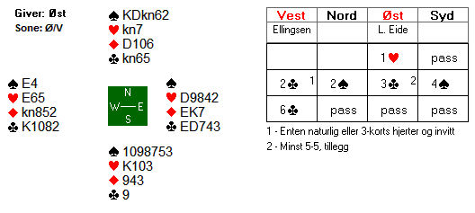 Aktuelt spilte Kristian hjerter ess og hjerter til dama. Da syd var utstyrt med K103 ble det to hjertertapere og ei beit i kontrakten. Hele spillet så slik ut: