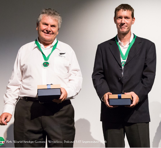 Etter min Europa-tur som ble avsluttet med fjorten dager i Polen (World Bridge Games) har det vært travelt. Tilbake i New Zealand var det å dra omtrent direkte til NZ Bridge Congress, en ukes festival av samme type som den norske bridgefestivalen. Der ble det suksess for mitt lag i NZ-Teams, og dermed min fjerde lagtittel i New Zealand på fem forsøk. De 108 lagene spilte først kvalifisering, så sluttspill for de seksten beste. På laget hadde jeg de nybakte verdensmestrene for par, Michael Cornell-Ashley Bach og min faste makker Michael Ware. Ware kunne imidlertid ikke delta de første dagene da han ikke hadde flere feriedager å bruke på bridge! Derfor spilte jeg med Cornells kone Vivien og Martin Reid i kvalifiseringen. Det er første gang jeg på et seksmannslag har vært nødt til å spille samtlge spill fra det første i kvalifiseringen til det siste i finalen den femte dagen. Slitsomt, men veldig morsomt når det ble seier.