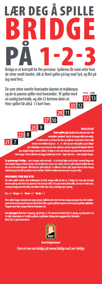 INFORMASJON OM ”LÆR BRIDGE PÅ 1-2-3” Både plakater (A3 og A2) kan fås tilsendt gratis ved henvendelse til bridge@bridge.no.