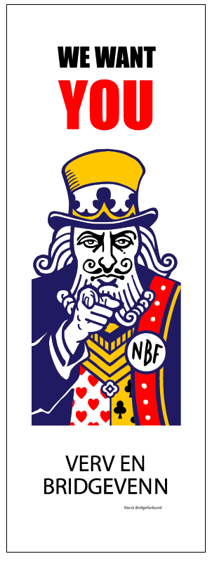 3 x roll up Roll up'ene er ca 90 cm x 2 meter i opprullet tilstand. Roll up'ene lånes ut gratis. Vi har tre sett á 3 roll up, og låner ut etter "Først-til-mølla"-prinsippet. Den som låner forplikter seg til å sende roll up'ene videre til neste klubb som ønsker å låne dem. Send e-post til bridge@bridge.no for å reservere. Klubber som vil lage sine egne roll up kan laste ned pdf av roll up'ene. OBS, stor fil. 2 x roll up Verv en Bridgevenn