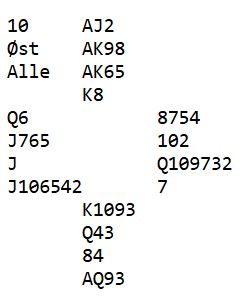 Alle kommer i 6NT med slike kort. Hvordan spiller du den kontrakten som nord med ruter 10 ut fra øst? (knekten kommer på fra vest)