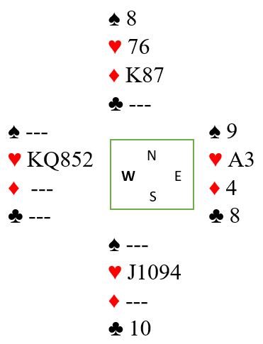 På spar 9 er syd ferdig. Kastes kløver 10 står østs åtter som sammen med tre hjerterstikk til slutt gir tretten stikk totalt. Og om syd kaster en hjerter går hjerteren.