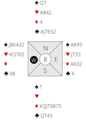 Bak +1190 til N/S kom ett par med +650 for 5 ruter doblet med tolv, to par med 4 ruter doblet med elleve stikk som gir +610, og tretten (!) par med 5 ruter doblet med elleve stikk (+550).