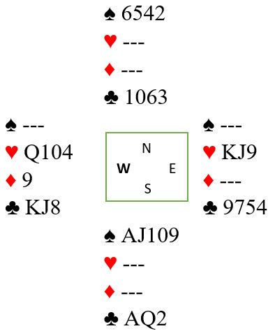Etter å ha tatt ut trumfen spilles altså sparen for å eliminere fargen og få til et innspill om nord har kløver 10 og syd begge kløverhonnørene. Siden sparen satt 3-3 forsvinner en kløver på vest fjerde spar, men med gjenværende A-J-9 er det fortsatt fare for to kløvertapere sett fra spilleførers synspunkt. Etter ruter ut til stjeling, to runder trumf og fire runder spar ser det slik ut: