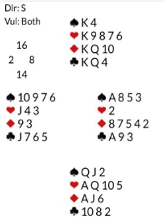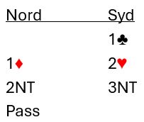 Over 1 kløver viste 1 ruter 4+ hjerterfarge ("kløverføringer"). Da viser åpnerens hopp 2 hjerter vanlig åpning, men alltid firekorts støtte. Meldingen 2 NT var så rundekrav som ba om flere opplysinger. Bedre informasjon enn å si at hun har trillrund hånd kan ikke åpneren gi, og det gjorde Elisabeth med 3NT. Da tok Sofie sjansen på å spille 3NT, og det var en helt bevisst sats selv om hun altså visste de hadde nikorts trumftilpasning i en majorfarge! Det er vel modig og god par-bridge med disse kortene og den informasjonen hun hadde?