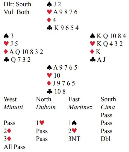 Utspillet ble hjerter 10 til liten, liten og kongen. Spar konge fikk beholde neste stikk. Spillefører (Martinez) fant en god fortsettelse med spar dame som tok med seg esset, ruteravkast fra vest og spar knekt fra nord. Syd skiftet til kløver 10 som fikk gå rundt til østs knekt. Så ble det spilt hjerter til knekten og esset. Syd kastet da en ruter. Nord fortsatte med hjerter for å presse ut østs dame, men spillefører lå unna og syd kvittet seg med en spar. Syd begynte å få pustebesvær...