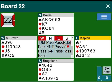 Brogeland-Bakke meldte 6 spar, en god slem. Øst spilte ut kløver 6. Da stikkes, så spilles trumf. Hvis trumfen sitter 2-2 blir det raskt "claim". En ruter kan jo trumfes hos syd og det blir kun en hjertertaper. På ess-konge i trumf fulgte vest farge, men øst viste seg å ha singelton trumf. Merk at om spar knekt hadde vært singel ville det vært nesten "claim" også med 3-1 i trumf siden en ruter kan stjeles før den siste trumfen tas ut. Det eneste som må til er i så fall at ikke ruter sitter 6-1 så den med singelton ruter kan trumfe i andre runde ruter. Og selv om ikke trumfen satt 3-1 er det en bra sjanse ved å ta A-K i ruter og spille en liten ruter til stjeling. Men slik det satt i Las Vegas ble det en sur bet: