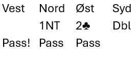 Vests pass er hårreisende, han har en grei 2 hjertermelding (eventuelt redobler siden han har tokorts spar også). De kan jo bli doblet i 2 hjerter eller 2 spar også, men det blir neppe så forferdelig galt. Forferdelig galt ble det i 2 kløver doblet...