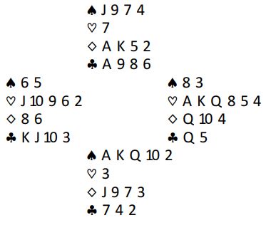 I alle klasser var det 12 N/S-par i 6 ruter, men bare Ludvigsen fant trumfutspillet. I Norges kamp mot Sveits i åpen klasse gikk det slik: