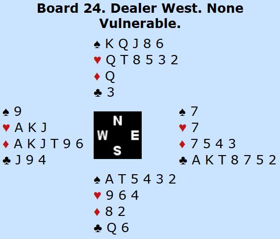 Kløver dame vant første stikk over knekten, så syv ganger ruter. Vest fikk fryktelig pustebesvær. Vest blir skvisinnspilt for elleve stikk, men da han blanket spar konge og esset ble spilt ble det det uvanlige resultatet tolv stikk i utgang (+490) hvor det er motparten som egentlig har utgang!