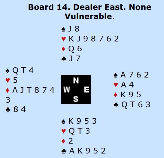 Legg merke til at N/S har 4 hjerter i kortene, men her ble altså kontrakten 3NT Ø/V. Syd trodde han hadde et bra utspill i kløver og sendte i vei kløver 2 (åpningsmeldingen viste tross alt bare 2+ kløver). Da var det ti sikre stikk, og det var jo ni sikre uansett utspill. I lagkamp betyr jo ikke overstikkene så mye, men det ble ekstra moro.