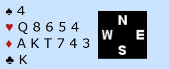 Nord dobler opplysende om vest åpner med 1 hjerter, og øst viser sin hånd med en melding som i parets system viser noe slikt som dette (enten vises mixed raise som er 6-9 med firekorts trumf, eller om man oppvurderer vises kanskje invitt+ med firekorts trumf). Syd bør være med til 3 spar, og da melder vest igjen. Det som kanskje best fungerer for at øst skal kunne vurdere godt er om han sier 4 ruter for å vise tofarget hånd. I slike meldingsforløp er det bra å få funnet ut om det er dobbeltilpasning (tilpasning i to farger), for da er det ofte mange stikk i begge retningene. Øst har en fin ruter dame og med så fin trumf bør han være med over N/S sin 4 spar hvis vest fikk vist frem ruterfargen. Men å si 4 hjerter med vests kort er greit det og (skjuler kortene bedre), men så idet de er med til 4 spar må vest vurdere om han skal gå på en gang til med sin litt uvanlige hånd for et slikt meldingsforløp.