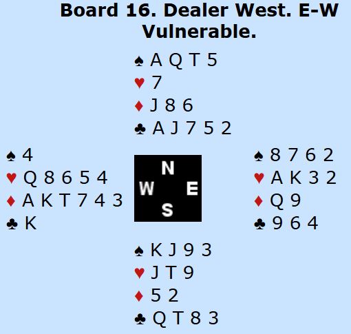 Heskje la spar 3 fra hånden, men nå skiftet Vest til kløver Dame. Øst stakk over med Kongen og fortsatte fargen da Syd dukket, og siden Øst hadde ruter Konge å komme inn på, endte det med hele 4 bet og 7 IMP til Frankrike, da N/S vant 3 ruter ved det andre bordet. Frankrike vant denne kampen 39-14.