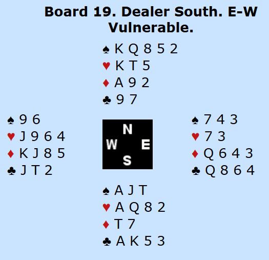 Så langt tenkte nok begge spilleførerne før de satte i gang. Men det gikk likevel litt for fort i første stikk da det begge slapp ruterutspillet til kongen og tok for A-K i trumf (satt 3-2). Så over på spar ess og en tredje runde trumf ble tatt. Men nå gikk det galt siden det satt slik fra start: