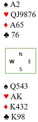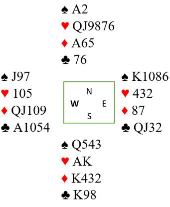 Syd åpnet med 1NT. Nord overførte til hjerter og meldte utgangen 4 hjerter. Fra vest kom ruter dame i utspill.