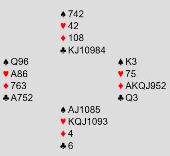 De aller fleste vil si 2 ruter, Michaels Cuebid - minst 5-5 i majorfargene. Det skjedde ved de fleste andre bordene. Man kan anta at nordmannen visste det var jevnt, men jeg vet ikke om han følte noe litt uvanlig måtte til i det siste spillet. Han fant dog en melding som er ganske spesiell med slike kort: 4 hjerter!