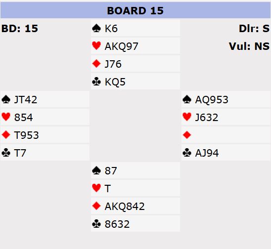 Randi Marie Olsen - Jan H. Olsen fra BK Mix Tromsø var det eneste paret som noterte +2140 for 7 ruter med tretten stikk. Ett par fikk tretten stikk i 6 ruter (nest topp). Ca. 30% av N/S-parene fikk tolv stikk i 6 ruter, og de andre N/S-parene var i 3NT med elleve stikk.