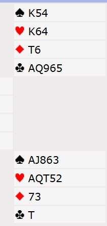 Makker (syd) åpnet med 3 ruter, og jeg sa naturlig nok 3NT. Øst følte seg robbet og doblet før det gikk pass rundt. Etter spar ut til kongen var det elleve sikre stikk, og det tolvte - det tredje doblede overstikket (!) - kom for sikkerhets skyld da øst kastet en hjerter idet alle ruterstikkene ble innkassert. Uten at vi hadde gjort noe som helst verken godt eller dårlig ble det altså N/S +1350 - en solid redusering av ledelsen deres. Og dette føltes nok ganske ille for øst, noe som kanskje påvirket "avgjørelsen" hans i motspillet i det neste spillet, og for meg som spillefører: