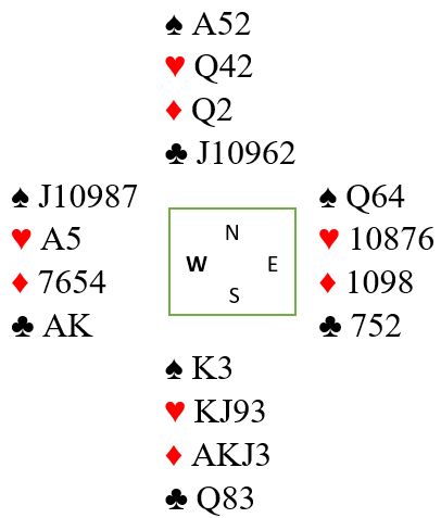 Det kom spar ut stukket hos syd fulgt av hjerter knekt. Vest må altså stikke, for hvis ikke får du tre hjerterstikk enkelt med liten som tar med seg esset "på luft". Vest stikker knekten og godspiller sparen. Andre spar kan lasjeres for å få mest mulig oversikt. Så kommer du inn på sparesset. Sparsitsen (5-3) og det med sparhonnørenes plassering er dermed bekreftet. Du tar nå fire runder ruter først og oppdager at vest startet med fire kort i den fargen. Du vet at vest har ess-konge i kløver om han ikke har åpnet i sonen med 8 eller 9 poeng. Og det betyr minst tokorts kløver hos vest som sammen med femkorts spar og firekorts ruter gjør at det ikke blir plass til mer enn dobbelton hjerter hos han!