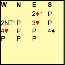 Det starter for de fleste med 1 hjerter - 1 spar. Vests hånd er litt ekkel å melde med vanlig system. For etter åpning med 1 hjerter er det litt for sterke kort for et hopp til 3 hjerter for eksempel over svaret 1 spar, og litt feil håndtype for et hopp direkte til 4 hjerter som ikke behøver å være beste kontrakt. Uten et spesielt opplegg for å melde kort med lang majorfarge og nesten sterke nok kort til 2 kløveråpning (god sekskorts farge og 18-20 poeng) må man bare velge en melding i andre melderunde, og hoppes til 3 hjerter (ca. 16-17) kan det noen ganger gå pass rundt. Å hoppe til 3NT er et alternativ, men det viser normalt gående farge. Og å ha tre små kløvere gjør dessuten at det ikke er ideelt å si 3NT.