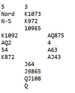 Der Ø/V var aktivt med i meldingene kom noen N/S-par i delkontrakt i ruter og fikk ti stikk som ga dem litt over middels. Mange var i 5 ruter som bør betes, men ved tre bord ble 5 ruter vunnet. Flere steder kom spar konge i utspill mot den utgangen. Da er det tredje sparstikket på en måte blokkert, men vest bør stikke over og spille mer spar. Øst vinner andre stikk og har igjen tre små spar sånn at spilleførers knekt er størst. Men øst spiller da liten spar til stjeling hos vest . en bet. Merk at vest ikke bør være redd for at nord har dobbel spar og kanskje stjeler over i tredje runde spar, for om han har det forsvinner ikke motspillstikket de eventuelt har for kløver ess!